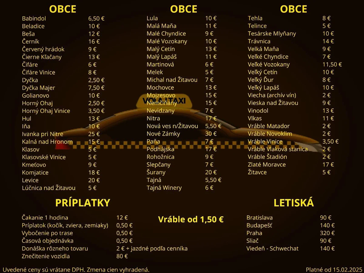 Sme najvýhodnejšie taxi vo Vrábloch a okolí. Zabezpečujeme jazdy v rámci mesta, medzi mestami, do okolitých obcí aj letiskové transfery po celom Slovensku a do zahraničia. Ponúkame výhodné ceny pri medzimestských jazdách – pri čakaní do 20 minút máte cestu späť zadarmo! Cena je vždy jasná vopred a počas jazdy sa nemení. Disponujeme aj vozidlami so systémom 4×4, vďaka čomu vieme zabezpečiť bezpečný presun. Samozrejmosťou sú čisté, komfortné vozidlá a profesionálny prístup vodičov. S nami cestujete bez kompromisov – pohodlne, bezpečne a za najlepšiu cenu.